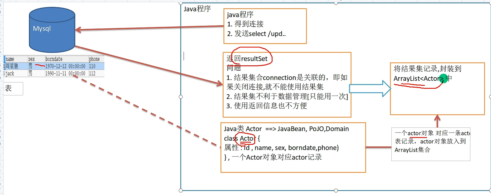 public class jdbc01 { public static void main(String[] args) throws IOException, ClassNotFoundException, SQLException { Properties properties = new Properties(); properties.load(new FileInputStream("src\\mysql.properties")); String user = properties.getProperty("user"); String pwd = properties.getProperty("password"); String driver = properties.getProperty("driver"); String url = properties.getProperty("url"); Class.forName(driver); Connection connection = DriverManager.getConnection(url, user, pwd); System.out.println(connection); //得到Statement Statement statement = connection.createStatement(); //sql语句 String sql = "select id, name, sex from actor"; //执行sql语句 ResultSet resultSet = statement.executeQuery(sql); //使用while循环输出 while (resultSet.next()){ int id = resultSet.getInt(1); String name = resultSet.getString(2); String sex = resultSet.getString(3); System.out.println(id+"\t"+name+"\t"+sex); } }