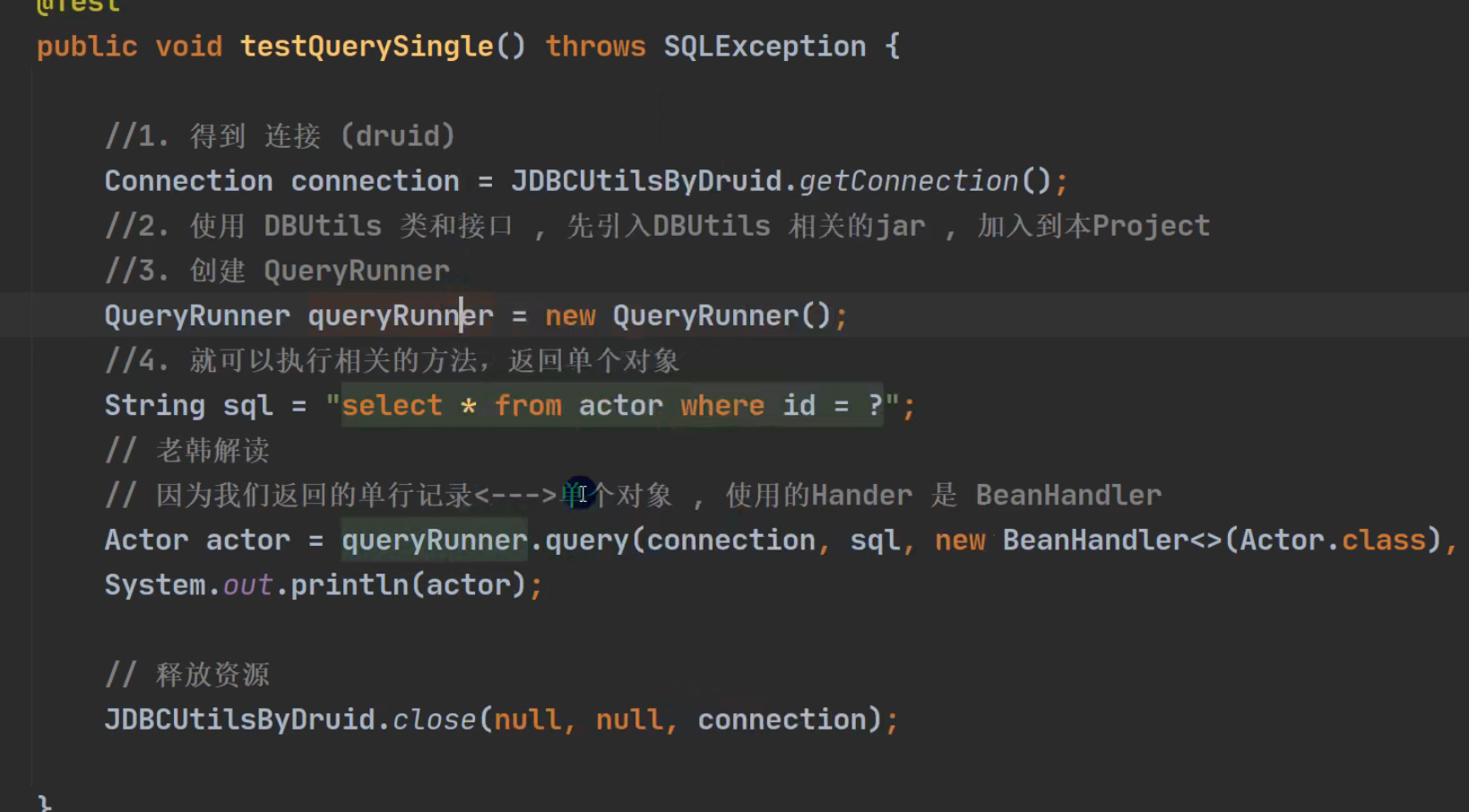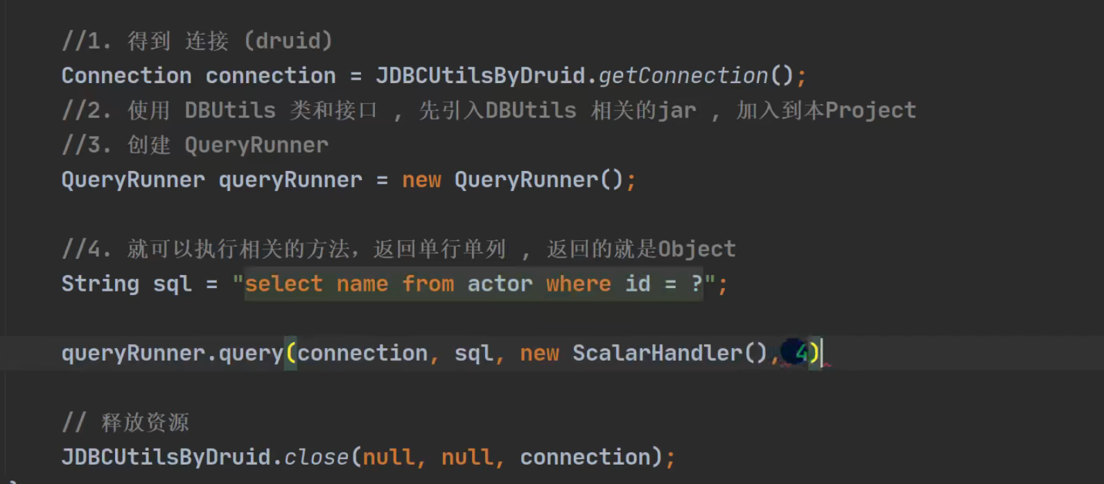 public class jdbcUtils_use { @Test public void testDML(){ //得到连接 PreparedStatement preparedStatement = null; Connection connection =null; //组织sql String sql = "update actor set name = ? where id = ?"; //创建PrepareStatement对象 try { connection = JDBCUtils.getConnection(); preparedStatement = connection.prepareStatement(sql); preparedStatement.setString(1,"mqs"); preparedStatement.setInt(2, 4); //执行 preparedStatement.executeUpdate(); } catch (SQLException e) { e.printStackTrace(); }finally { //关闭资源 JDBCUtils.close(null,preparedStatement,connection); } } }