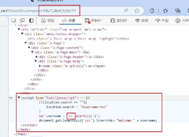 var username = 'xss'; //使用';结束前面的语句,后面加上函数alert(1);使用'1闭合后面的单引号,当然你也可以使用将其注释(//)