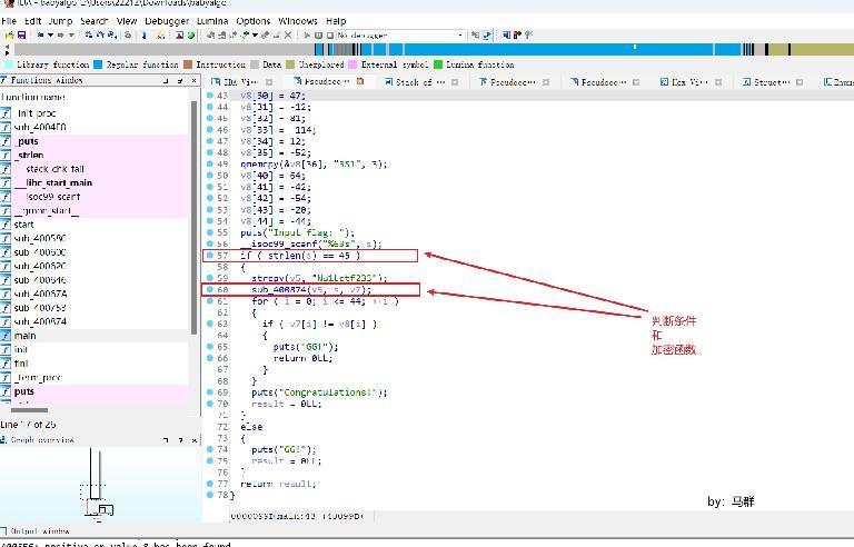 - 分析代码段if ( strlen(s) == 45 ),sub_400874加密函数