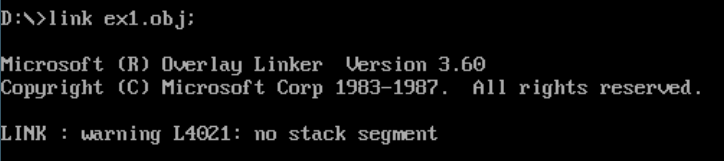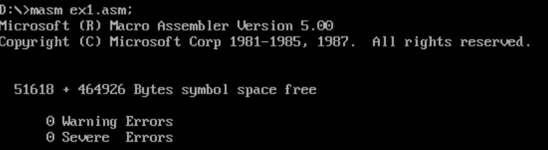 使用 masm、link 对 ex1.asm 进行汇编、连接、运行,观察结果: