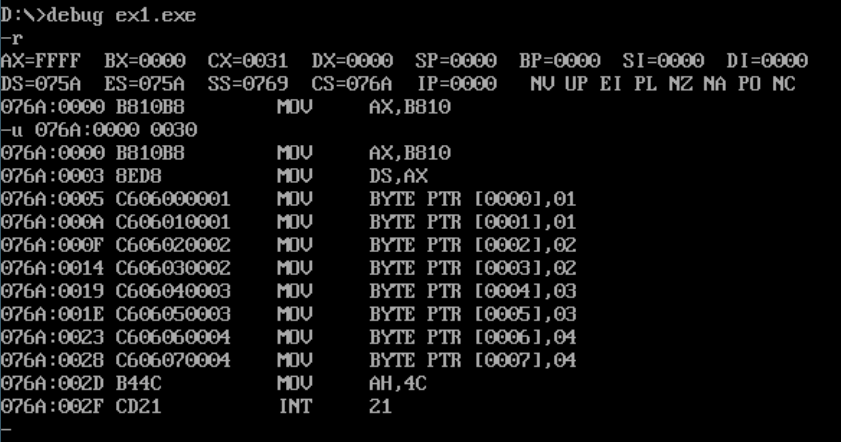 但 ex1.asm 是通过 byte ptr 的形式直接填入 8 个数,而 ex2.asm 是通过循环递增 ax,并填入 bx 且移位,来实现数的填入。