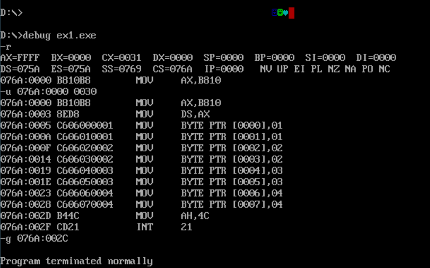 - 掌握了完整汇编源程序编写、汇编、连接、运行、调试的方法