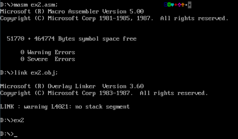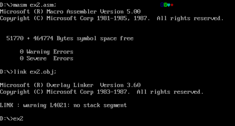 使用 masm、link 对 ex2.asm 进行汇编、连接、运行,观察结果: