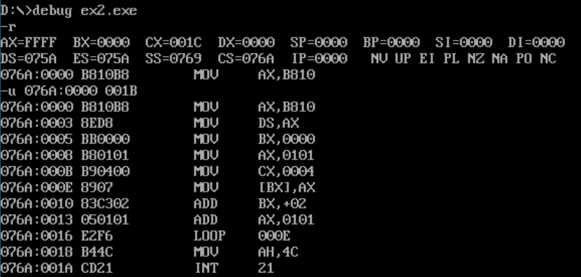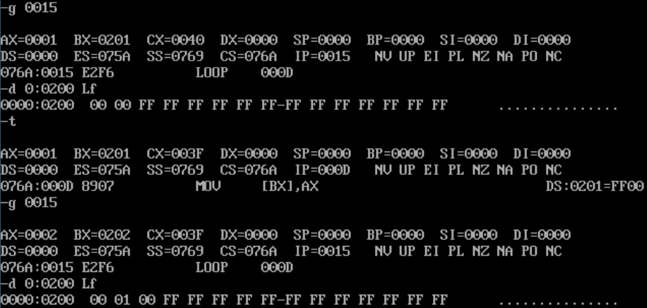 - 掌握了通过使用寄存器 cx 中的值来使用 u 命令精确反汇编的方法:寄存器 cx 存的值为程序段的字节数
