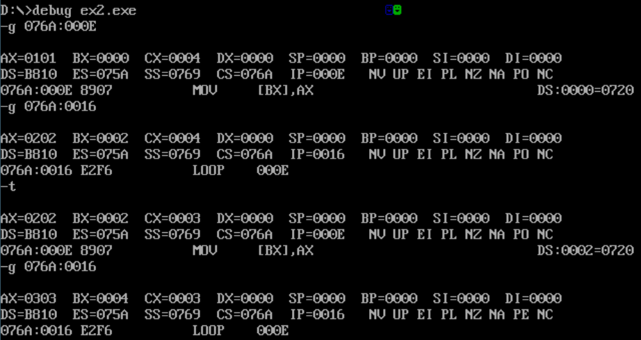 然后进行第一次循环,使用 t 命令执行loop,再进行第二次循环: