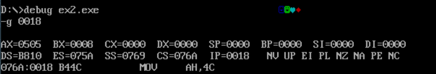 将 ex2.asm 中 line9 mov cs, 4 改成 mov cx, 8,重新汇编、链接、运行: