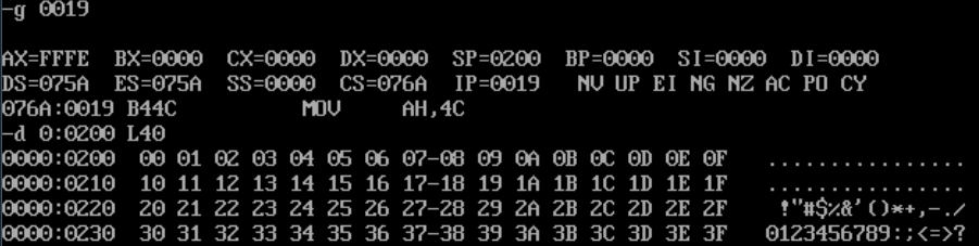 此任务要求将 mov ax,4c00h 前的代码复制到内存 0:200 处,所以关键在于确认要复制多少字节,可以先将代码随意补全,使用 debug 观察寄存器 CX 的值,并使用 u 命令精确反汇编,来确认需要复制的字节数。