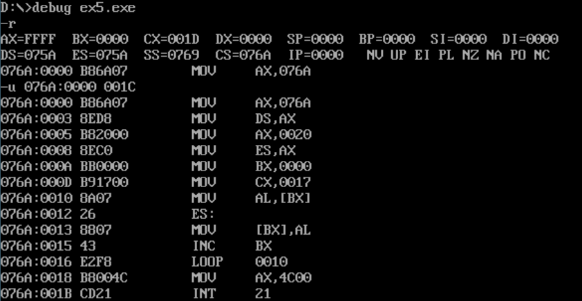 由此可知,mov ax,4c00h 命令位于 0018h,所以需要复制 0~0017 所有字节。因为使用 al 每次复制一字节,所以应将 0017h 赋给 cx。可由 寄存器 cs 得出要复制的代码原先位于 076A 段,所以,应该将 076Ah 赋给 ax