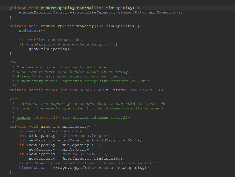这里能看出每次插入的时候先计算当前容量,若容量不足时会进行扩容操作,扩容容量为原容量+原容量右移位1,