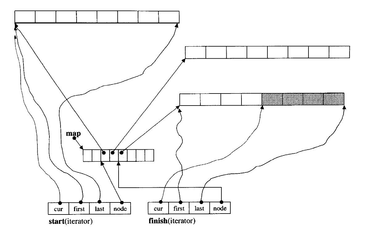 iterator start; iterator finish; map_pointer map; size_type mapsize;//map大小