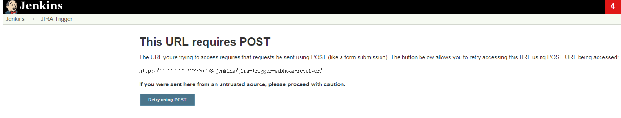 3、接口调试,通过访问 http://ip:20003/jenkins/jiratriggerwebhookreceiver/ ,可查看jenkins接口是的能调通,若出现下图,则表示可以调通: