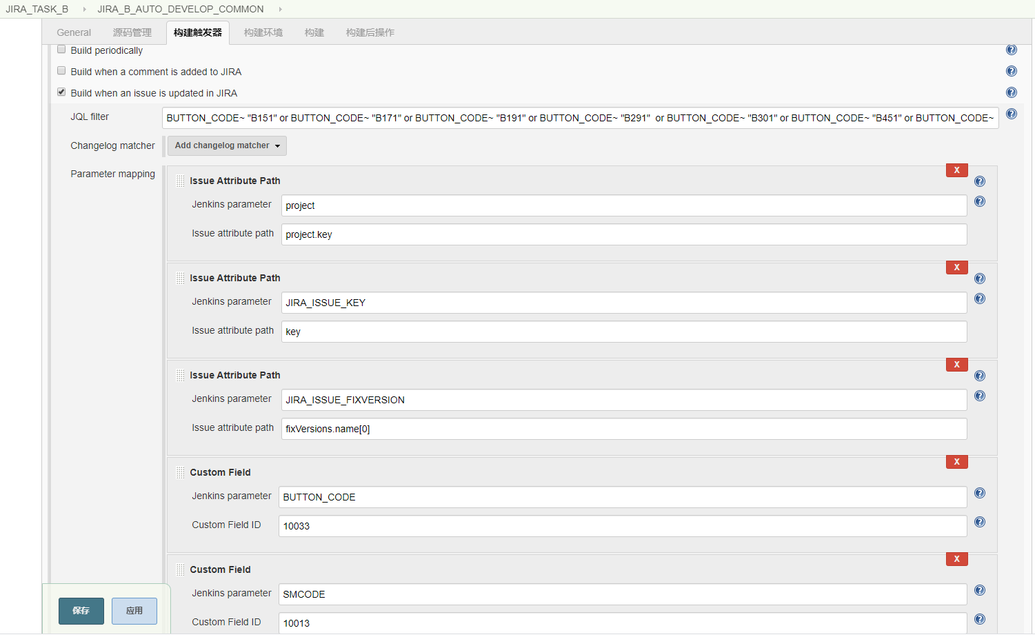 上面分别创建了JIRA的两个任务流程,每个任务流程的每个按钮都分别有个唯一的key值,通过jira点击相应的按钮,通过唯一的key可以触发jenkins的脚本进行唯一的构建。