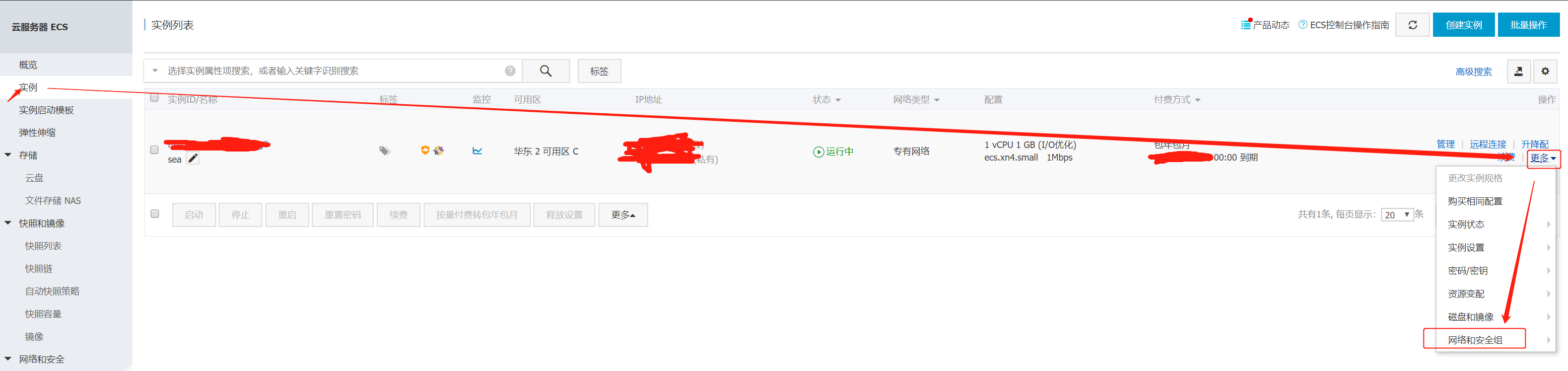 二、点击列表最右边的更多按钮,选择网络和安全组,然后再点击安全组配置