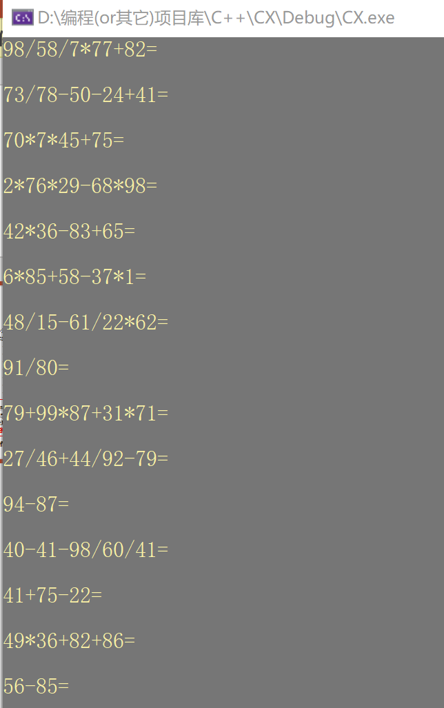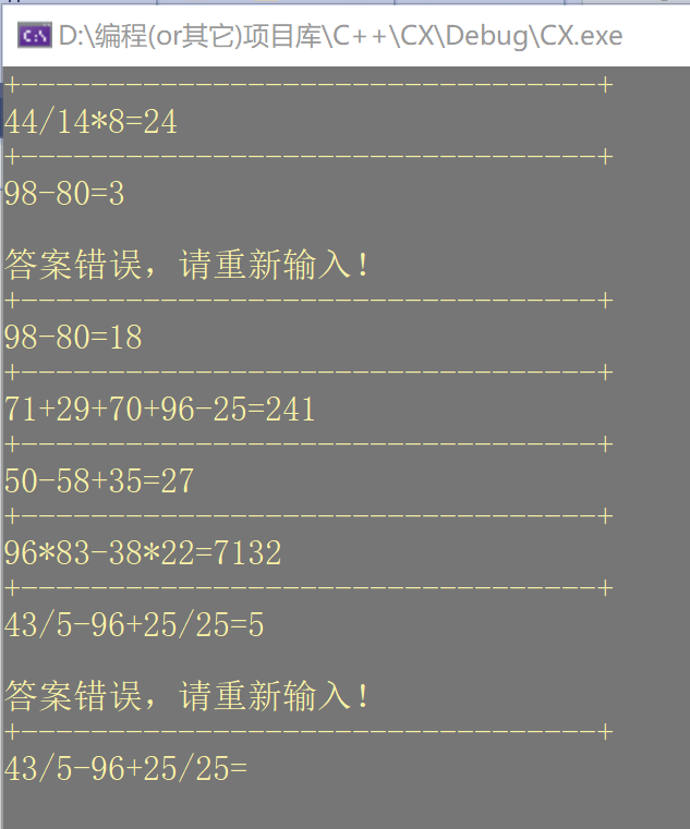 #include <random> #include<string> #include <iostream> #include <stack> #include <unordered_map> using namespace std; const int ADD = 0; const int SUB = 1; const int MUL = 2; const int DIV = 3; const string ope[4] = { "+","-","*","/" }; class Question { public: string content; int ans; Question() :content(""), ans(0) {}; Question(string con, int ans) { this->content = con; this->ans = ans; } void print_ques(); }; void Question::print_ques() { cout << this->content << "=" << endl << endl; } // 生成随机整数的函数,包含端点 int generateRandomInt(int min, int max) { // 使用 C++11 随机数引擎 std::random_device rd; // 随机设备,用于获取种子 std::mt19937 gen(rd()); // Mersenne Twister 随机数引擎 std::uniform_int_distribution<int> dis(min, max); // 均匀分布整数 return dis(gen); // 生成并返回随机整数 } //传入四则运算数学表达式的字符串,返回int结果 int calculateMathExpression(const std::string& expr) { std::stack<int> numStack; // 存放数字的栈 std::stack<char> opStack; // 存放操作符的栈 std::unordered_map<char, int> precedence = { {'+', 1}, {'-', 1}, {'*', 2}, {'/', 2} }; // 运算符的优先级映射 int i = 0; while (i < expr.length()) { char c = expr[i]; if (isdigit(c)) { int num = 0; while (i < expr.length() && isdigit(expr[i])) { num = num * 10 + (expr[i] - '0'); i++; } numStack.push(num); } else if (c == '+' || c == '-' || c == '*' || c == '/') { while (!opStack.empty() && precedence[opStack.top()] >= precedence[c]) { char op = opStack.top(); opStack.pop(); int num2 = numStack.top(); numStack.pop(); int num1 = numStack.top(); numStack.pop(); int result = 0; if (op == '+') { result = num1 + num2; } else if (op == '-') { result = num1 - num2; } else if (op == '*') { result = num1 * num2; } else if (op == '/') { result = num1 / num2; } numStack.push(result); } opStack.push(c); i++; } else { i++; } } while (!opStack.empty()) { char op = opStack.top(); opStack.pop(); int num2 = numStack.top(); numStack.pop(); int num1 = numStack.top(); numStack.pop(); int result = 0; if (op == '+') { result = num1 + num2; } else if (op == '-') { result = num1 - num2; } else if (op == '*') { result = num1 * num2; } else if (op == '/') { result = num1 / num2; } numStack.push(result); } return numStack.top(); } //随机生成算式 Question generate_ques() { int n = generateRandomInt(1, 4); string con = ""; n = 2 * n + 1; int* a = new int[n]; for (int i = 0; i < n; i++) a[i] = generateRandomInt(1, 99); for (int i = 0; i < n; i++) { if (i % 2 == 0) con.append(to_string(a[i])); else { int index = a[i] % 4; con.append(ope[index]); } } Question A(con, calculateMathExpression(con)); return A; } //菜单界面 void title() { Question A[100]; for (int i = 0; i < 100; i++) A[i] = generate_ques(); cout << "<--说明:本程序会自动生成100道数学计算题,只涉及加减乘除四种运算符,操作数的范围:[1,99].\n"; cout << "在答题时输入114可退出程序,输入514可跳过本题。\n"; cout << "注意!不支持浮点数的运算,因此带有除法的算式得出的结果可能会与手算或计算器结果不同\n"; cout << endl << endl; while (true) { cout << "\t\t\t\t+---------------------------------+\n"; cout << "\t\t\t\t+-----------1->查看题目-----------+\n"; cout << "\t\t\t\t+-----------2->开始做题-----------+\n"; cout << "\t\t\t\t+-----------3->退出---------------+\n"; cout << "\t\t\t\t+---------------------------------+\n"; /*cout << "\n1->查看题目" << endl; cout << "2->开始做题" << endl; cout << "3->退出" << endl << endl;*/ cout << "请输入指令:"; int o; cin >> o; switch (o) { case 1: { system("cls"); for (int i = 0; i < 100; i++) A[i].print_ques(); break; } case 2: { system("cls"); for (int i = 0; i < 100; i++) { cout << "+---------------------------------+" << endl; cout << A[i].content << "="; int ans; cin >> ans; if (ans == A[i].ans) continue; else if (ans == 114)return; else if (ans == 514) { cout << "跳过此题" << endl; continue; } else { cout << "\n答案错误,请重新输入!" << endl; i--; } } break; } case 3: { return; } default: { cout << endl << "给你一拳,让你瞎按" << endl << endl; } } } } int main() { system("color 8E"); title(); system("pause"); return 0; }