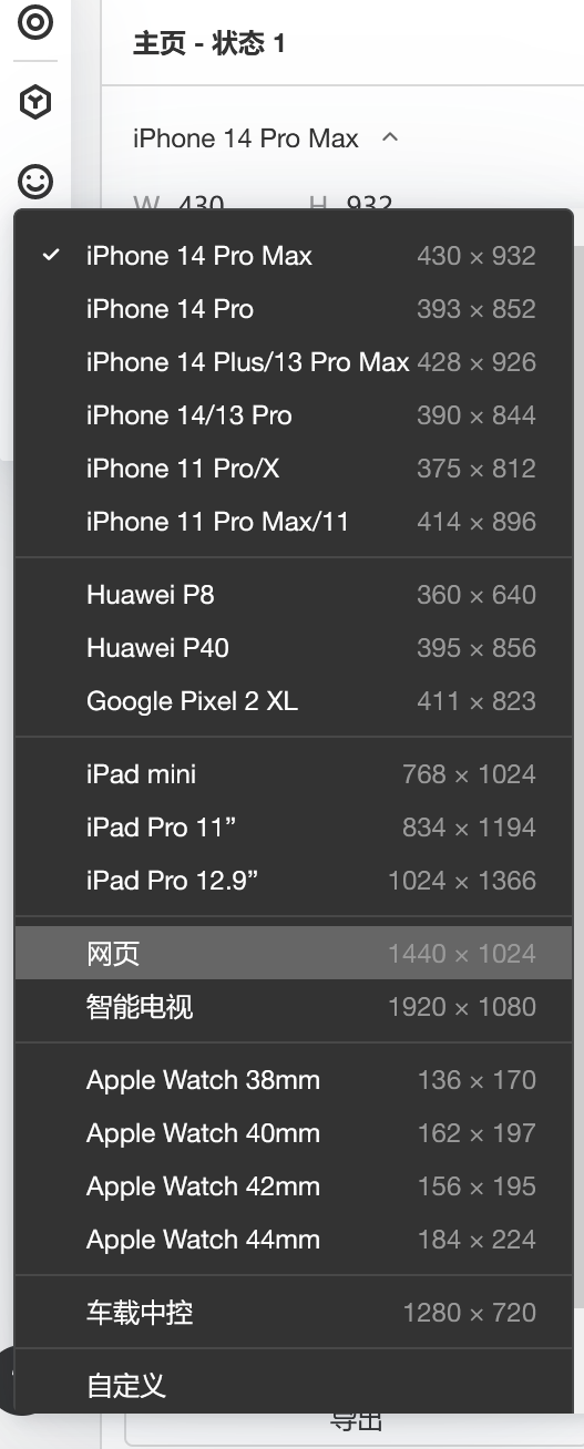 上一个例子中设计的原型为一款自制游戏的原型,使用的是PC端的尺寸。此外还有手机端的界面尺寸可以选择,如下图所示: