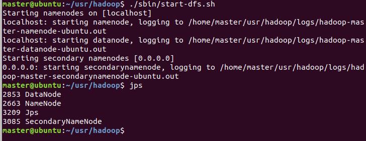 开启hdfs: /home/master/usr/hadoop (注意是自己的hadoop目录)