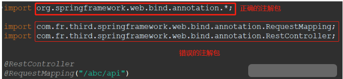 引入的RestController和RequestMapping类注解不是"org.springframework.web.bind.annotation"包下的,而是“com.fr.third.springframework.web.bind.annotation”下的。