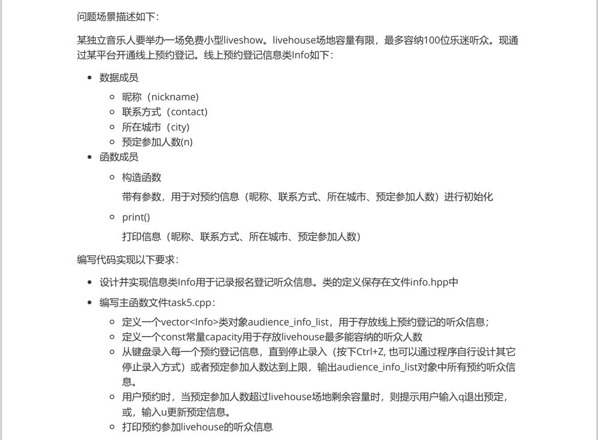 在第一个任务livehouse预约登记中,判断循环的条件可以改为while(cin>>a&&a!="#stop#"),这样可以使代码更加简洁(我的代码中出现了相同的代码片段);需要熟悉并灵活运用vector中的操作和auto的使用。
