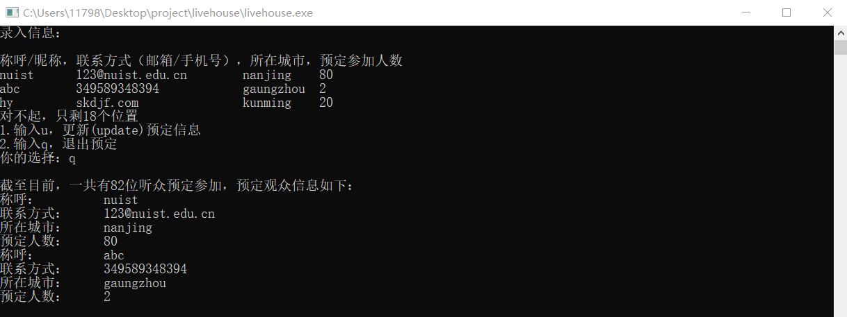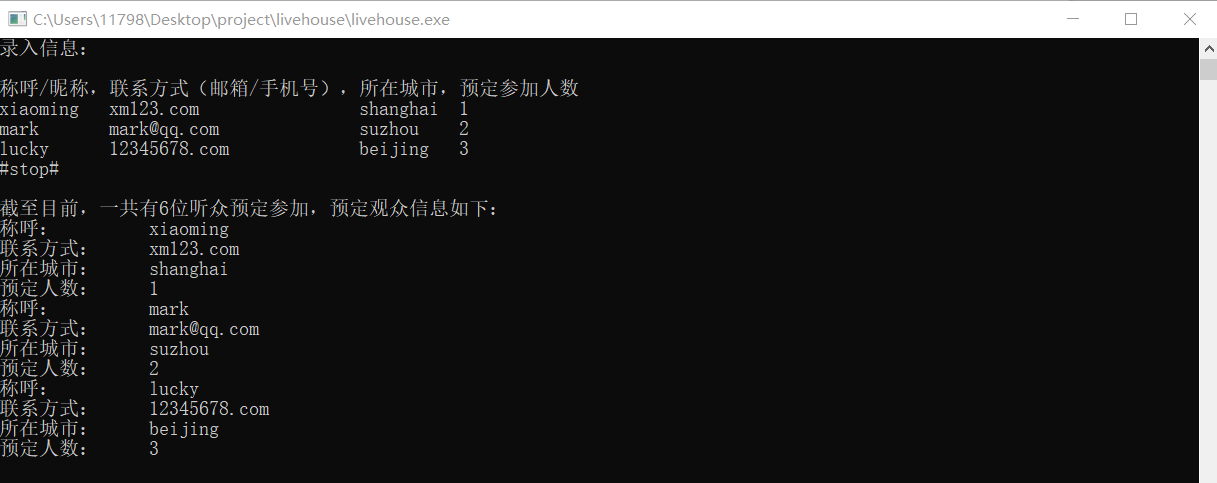 cout<<"截至目前,一共有"<<sum<<"位听众预定参加,预定观众信息如下:"<<endl;