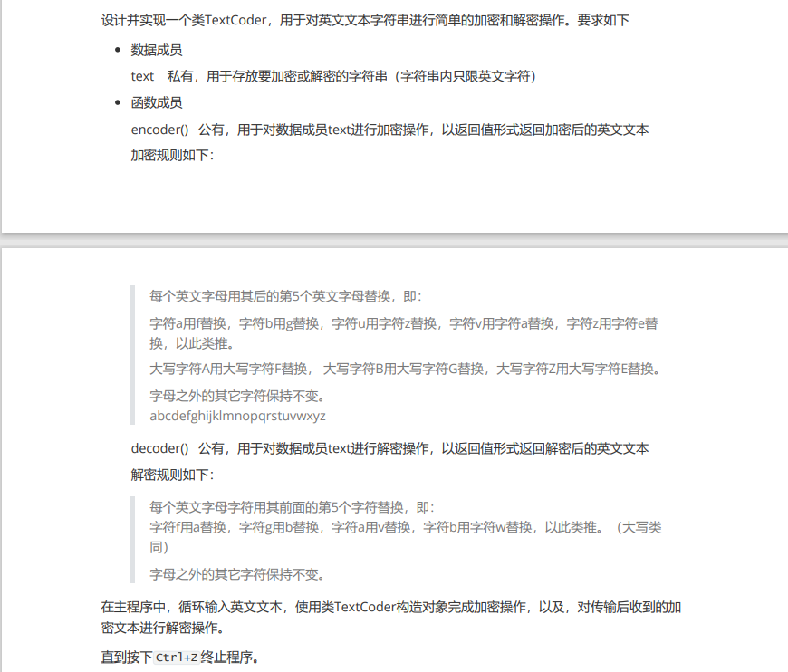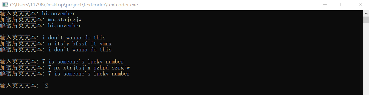#include "TextCoder.hpp" #include <iostream> #include <string> int main() { using namespace std; string text, encoded_text, decoded_text; cout << "输入英文文本: "; while (getline(cin, text)) { encoded_text = TextCoder(text).encoder(); // 这里使用的是临时无名对象 cout << "加密后英文文本:\t" << encoded_text << endl; decoded_text = TextCoder(encoded_text).decoder(); // 这里使用的是临时无名对象 cout << "解密后英文文本:\t" << decoded_text << endl; cout << "\n输入英文文本: "; } }