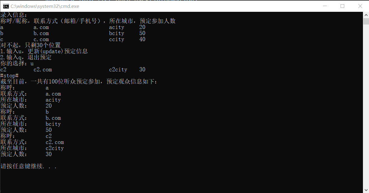 cout<<"称呼/昵称,联系方式(邮箱/手机号),所在城市,预定参加人数"<<endl;