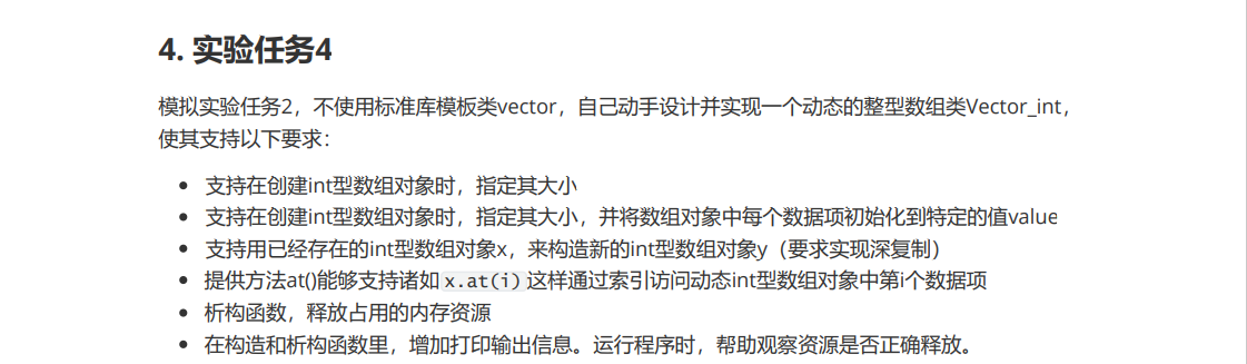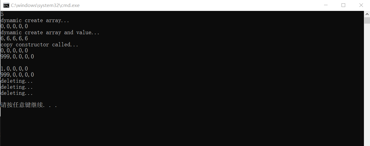 #ifndef VECTOR_INT_HPP #define VECTOR_INT_HPP #include<iostream> #include<cassert> using namespace std; class Vector_int { private: int size; int *p; public: Vector_int(int n); Vector_int(int n,int value); Vector_int(const Vector_int &a); int &at(int index); void print()const; ~Vector_int(); }; Vector_int::Vector_int(int n):size(n) { cout << "dynamic create array..." << endl; p = new int[n]; for(auto i=0;i<size;i++) p[i]=0; } Vector_int::Vector_int(int n,int value):size(n) { cout << "dynamic create array and value..." << endl; p = new int[n]; for(auto i=0;i<size;i++) p[i]=value; } Vector_int::Vector_int(const Vector_int&a):size(a.size) { cout << "copy constructor called..." << endl; p = new int[size]; for(auto i=0;i<size;i++) p[i]=a.p[i]; } int &Vector_int::at(int index) { assert(index >= 0 && index < size); return p[index]; } void Vector_int::print()const { for(auto i=0;i<size;i++) cout<<p[i]<<","; cout<<"\b "<<endl; } Vector_int::~Vector_int() { cout << "deleting..." << endl; delete[] p; } #endif
