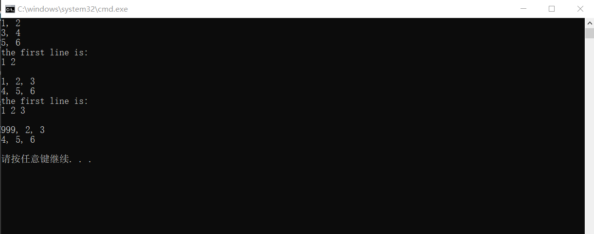 #include <iostream> #include "matrix.hpp" int main() { using namespace std; double x[] = {1, 2, 3, 4, 5, 6}; Matrix m1(3, 2); // 创建一个3×2的矩阵 m1.set(x); // 用一维数组x的值按行为矩阵m1赋值 m1.print(); // 打印矩阵m1的值 cout << "the first line is: " << endl; cout << m1.at(0, 0) << " " << m1.at(0, 1) << endl; cout << endl; Matrix m2(2, 3); m2.set(x); m2.print(); cout << "the first line is: " << endl; cout << m2.at(0, 0) << " " << m2.at(0, 1) << " " << m2.at(0, 2) << endl; cout << endl; Matrix m3(m2); m3.set(0, 0, 999); m3.print(); }
