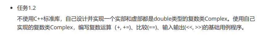 #include<iostream> using namespace std; class Complex { private: double real,image; public: Complex(double real0=0,double image0=0):real{real0},image{image0}{} ~Complex()=default; Complex& operator+=(const Complex &c1); friend Complex operator+(const Complex &c1,const Complex &c2); friend bool operator==(const Complex &c1,const Complex &c2); friend ostream& operator<<(ostream &out,const Complex &c1); friend istream& operator>>(istream &in,Complex &input); }; Complex& Complex::operator+=(const Complex &c1) { real+=c1.real; image+=c1.image; return *this; } ostream& operator<<(ostream &out,const Complex &c1) { if(c1.image>0) out<<c1.real<<"+"<<c1.image<<"i"; else if(c1.image<0) cout<<c1.real<<"-"<<c1.image<<"i"; else cout<<c1.real; return out; } istream& operator>>(istream &in,Complex &input) { in>>input.real>>input.image; return in; } Complex operator+(const Complex &c1,const Complex &c2) { Complex c; c.real=c1.real+c2.real; c.image=c1.image+c2.image; return c; } bool operator==(const Complex &c1,const Complex &c2) { if(c1.real==c2.real&&c1.image==c2.image) return true; else return false; } int main() { using namespace std; Complex c1{2, 4}, c2; cin >> c2; cout << c1 << endl; cout << c2 << endl; cout << c1 + c2 << endl; c1 += c2; cout << c1 << endl; cout << boolalpha << (c1 == c2) << endl; }