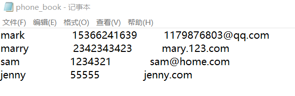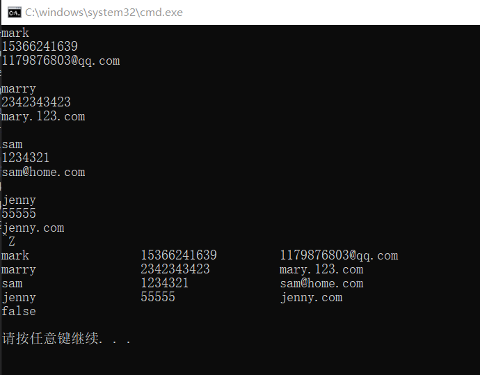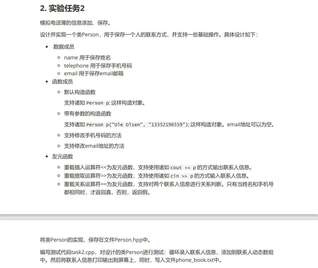 #include<iostream> #include<fstream> #include<string> #include<iomanip> #include<vector> using std::string; using std::istream; using std::ostream; using std::setw; using std::left; using std::endl; class Person { private: string name,telephone,email; public: Person()=default; Person(string name0,string tele0,string email0=""):name{name0},telephone{tele0},email{email0}{} void tele_modify(Person &p,string tele0); void email_modify(Person &p,string email0); ~Person()=default; friend ostream& operator<<(ostream &out,const Person &p); friend istream& operator>>(istream &in,Person &p); friend bool operator==(Person &p1,Person &p2); }; void Person::tele_modify(Person &p,string tele0) { p.telephone=tele0; } void Person::email_modify(Person &p,string email0) { p.email=email0; } ostream& operator<<(ostream &out,const Person &p) { out<<left<<setw(20)<<p.name<<left<<setw(20)<<p.telephone<<left<<setw(20)<<p.email; return out; } istream& operator>>(istream &in,Person &p) { in>>p.name>>p.telephone>>p.email; return in; } bool operator==(Person &p1,Person &p2) { if(p1.name==p2.name&&p1.telephone==p2.telephone) return true; else return false; }