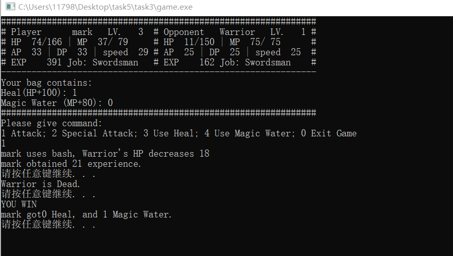 //======================= // main.cpp //======================= // main function for the RPG style game #include <iostream> #include <string> using namespace std; #include "swordsman.h" int main() { string tempName; bool success=0; //flag for storing whether operation is successful cout <<"Please input player's name: "; cin >>tempName; // get player's name from keyboard input player *human; // use pointer of base class, convenience for polymorphism int tempJob; // temp choice for job selection do { cout <<"Please choose a job: 1 Swordsman, 2 Archer, 3 Mage"<<endl; cin>>tempJob; system("cls"); // clear the screen switch(tempJob) { case 1: human=new swordsman(1,tempName); // create the character with user inputted name and job success=1; // operation succeed break; default: break; // In this case, success=0, character creation failed } }while(success!=1); // so the loop will ask user to re-create a character int tempCom; // temp command inputted by user int nOpp=0; // the Nth opponent for(int i=1;nOpp<5;i+=2) // i is opponent's level { nOpp++; system("cls"); cout<<"STAGE" <<nOpp<<endl; cout<<"Your opponent, a Level "<<i<<" Swordsman."<<endl; system("pause"); swordsman enemy(i, "Warrior"); // Initialise an opponent, level i, name "Junior" human->reFill(); // get HP/MP refill before start fight while(!human->death() && !enemy.death()) // no died { success=0; while (success!=1) { showinfo(*human,enemy); // show fighter's information cout<<"Please give command: "<<endl; cout<<"1 Attack; 2 Special Attack; 3 Use Heal; 4 Use Magic Water; 0 Exit Game"<<endl; cin>>tempCom; switch(tempCom) { case 0: cout<<"Are you sure to exit? Y/N"<<endl; char temp; cin>>temp; if(temp=='Y'||temp=='y') return 0; else break; case 1: success=human->attack(enemy); human->isLevelUp(); enemy.isDead(); break; case 2: success=human->specialatt(enemy); human->isLevelUp(); enemy.isDead(); break; case 3: success=human->useHeal(); break; case 4: success=human->useMW(); break; default: break; } } if(!enemy.death()) // If AI still alive enemy.AI(*human); else // AI died { cout<<"YOU WIN"<<endl; human->transfer(enemy); // player got all AI's items } if (human->death()) { system("cls"); cout<<endl<<setw(50)<<"GAME OVER"<<endl; delete human; // player is dead, program is getting to its end, what should we do here? system("pause"); return 0; } } } delete human; // You win, program is getting to its end, what should we do here? system("cls"); cout<<"Congratulations! You defeated all opponents!!"<<endl; system("pause"); return 0; }