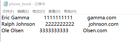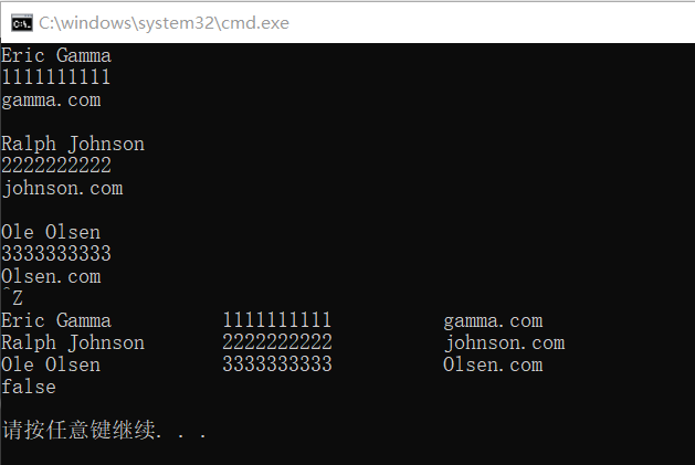 #include <iostream> #include <fstream> #include <vector> #include "Person.hpp" int main() { using namespace std; vector<Person> phone_book; Person p; while(cin>>p) phone_book.push_back(p); for(auto &i: phone_book) cout << i << endl; cout << boolalpha << (phone_book.at(0) == phone_book.at(1)) << endl; ofstream fout; fout.open("phone_book.txt"); if(!fout.is_open()) { cerr << "fail to open file phone_book.txt\n"; return 1; } for(auto &i: phone_book) fout << i << endl; fout.close(); }