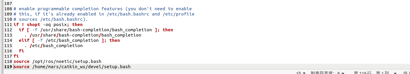 step2.在文件的最后一行加入:source /home/用户名/工作空间名/devel/setup.bash。如下图