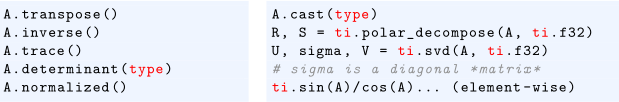 C=ti.Matrix(2,2,dt=ti.f32,shape=(3,5)) # A tensor of 3x5 2x2 matrices