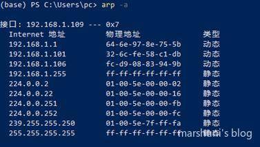 arp -a,查看当前arp表。可以看出,arp映射分为动态与静态两种。静态映射中的IP-MAC对通常具有特殊作用。例如查询资料可知,位于 224.0.0.0 到 239.255.255.255 端的IP被用于将数据包发送到多个目的地,这类地址被称为多播地址;255.255.255.255 为广播地址。而动态的条目通常是局域网中真实存在的主机。例如 192.168.1.1 是本机所连接到路由器的IP地址。