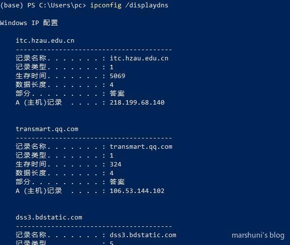 ipconfig /displaydns 可以显示本机上的DNS域名解析列表。在需要频繁访问某一网站的情况下,若每访问一次,都根据域名向DNS服务器请求解析一次,无疑会造成资源的浪费。因此系统会将请求到的DNS记录缓存在本地,在后续的访问中,将直接根据本地的缓存定位到对应的服务器。