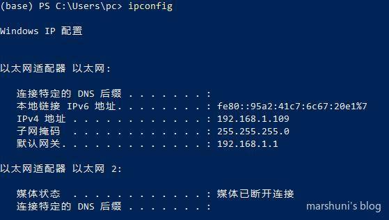 ipconfig 命令如图所示,显示了TCP/IP协议的配置信息。