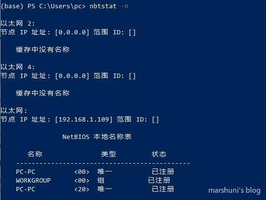 nbtstat -n 查看本机目前的NetBIOS名称。可以在目前已经连接到的网络上看到本机的名称。