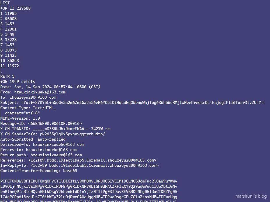 LIST命令列出邮件,使用RETR <email_number> 命令检索特定邮件。此处选择查看长度较短的第5封邮件。输入 RETR 5 返回邮件内容。可以从消息头看出来,该封邮件来自信息学科部,发送时间为 9 月 14 日 00:57 分。邮件内容采用base64编码。将其复制到解码器中解码,可查看邮件内容。