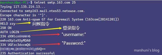 telnet 连接到SMTP服务器发送邮件。 使用 telnet smtp.163.com 25 连接到网易邮箱的SMTP服务器,并执行登录操作。需要注意的是,登录时的用户名与密码需要经过base64编码。出现Authentication successful,则说明登录成功。