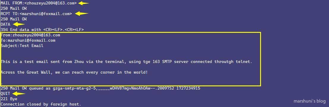 - 登录后在终端发送邮件,如下图所示。图中黄色标记的为手动输入的内容。在发送