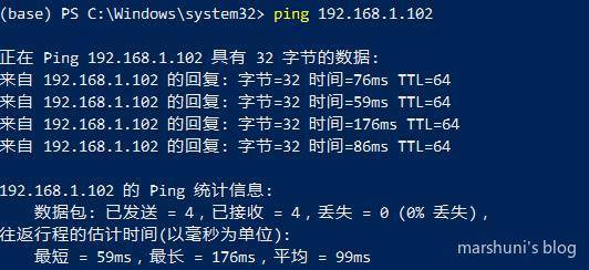 - 同样,ping命令也可以检查局域网中的主机是否在线。例如此处尝试ping位于同一局域网下的手机。