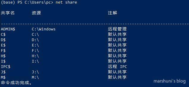 net share 命令查看本机上所有的共享资源。可以看到当前本机存在的共享磁盘。(多用户间共享)