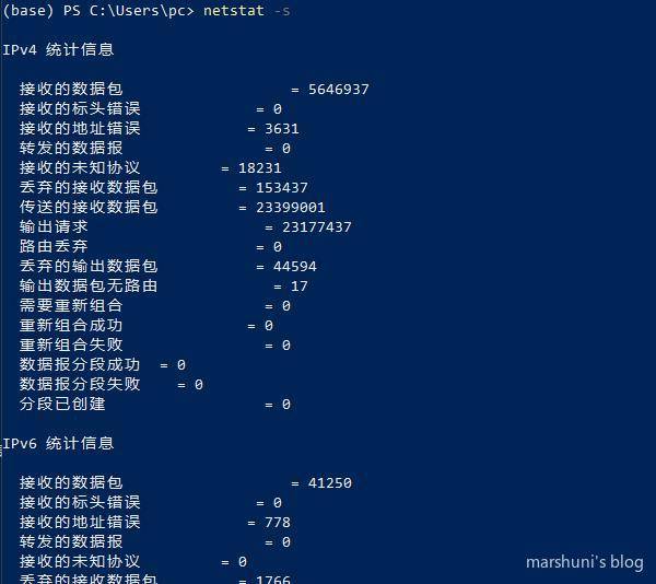 netstat -s 可以查看各个协议的统计信息,即一共发送/接收的多少这一协议下的数据包。