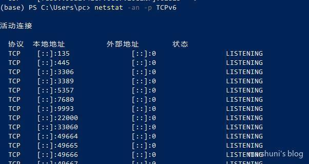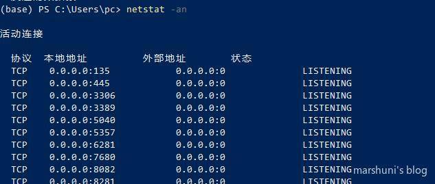 netstat -an 可以查看当前的所有连接。其中参数 -n 表示以数字形式显示目标,而非主机名。同样,也可以使用参数 -p [协议] 来对条目进行筛选。