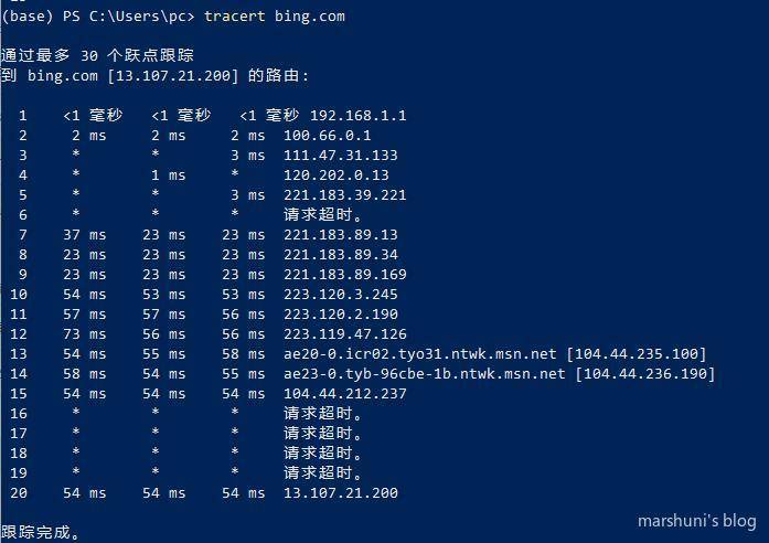 - tracert命令和ping命令类似,可以直接在后接域名或者IP地址。此处追踪