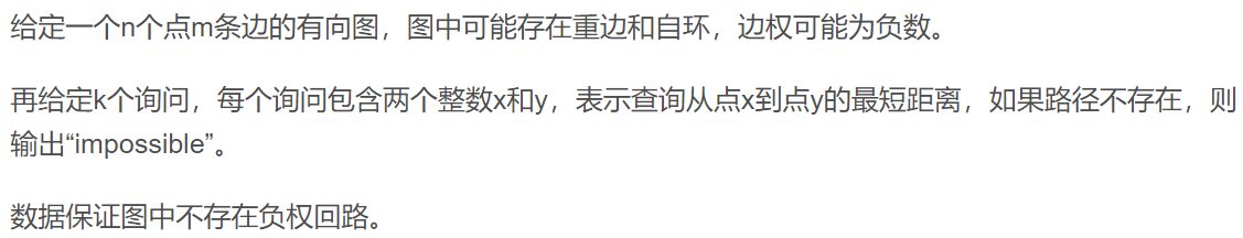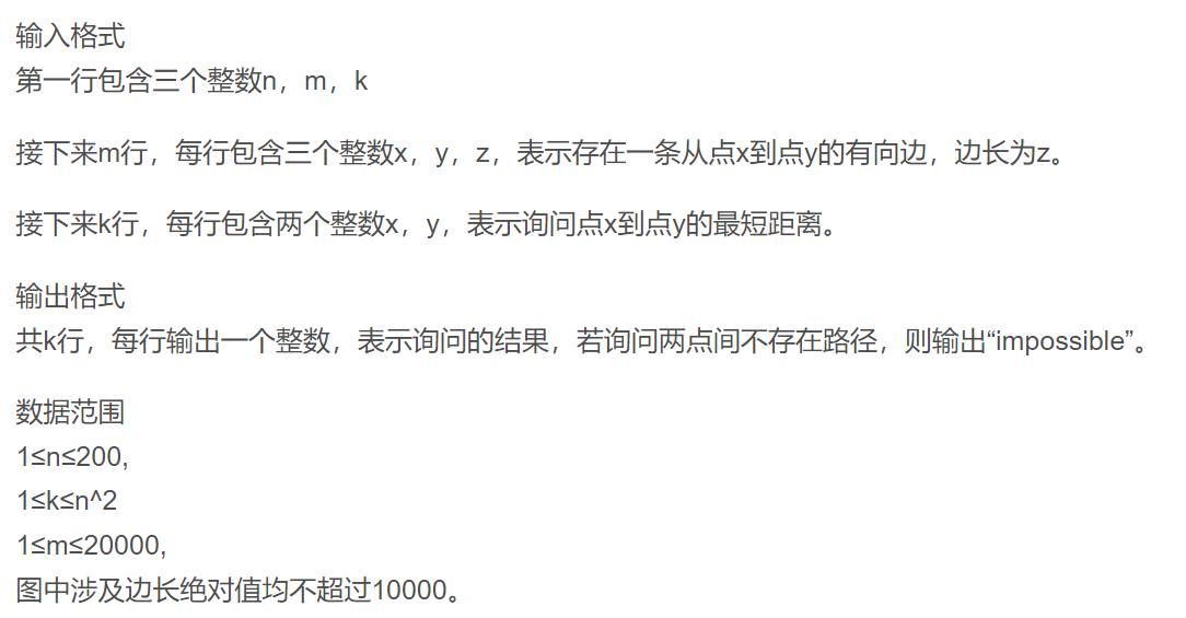 1 #include<bits/stdc++.h> 2 using namespace std; 3 const int N=210,INF=1e9; 4 int n,m,k; 5 int f[N][N]; 6 7 void floyd() 8 { 9 for(int k=1; k<=n; k++) 10 for(int i=1; i<=n; i++) 11 for(int j=1; j<=n; j++) 12 f[i][j]=min(f[i][j],f[i][k]+f[k][j]); 13 } 14 15 int main() 16 { 17 cin>>n>>m>>k; 18 for(int i=1; i<=n; i++) 19 { 20 for(int j=1; j<=n; j++) 21 { 22 f[i][j]= i==j?0:INF; 23 } 24 } 25 for(int i=1; i<=m; i++) 26 { 27 int x,y,z; 28 cin>>x>>y>>z; 29 f[x][y]=min(f[x][y],z);//因为有重边 30 } 31 floyd(); 32 while(k--) 33 { 34 int x,y; 35 cin>>x>>y; 36 if(f[x][y]>INF/2)//INF/2的原因见上 37 cout<<"impossible"<<endl; 38 else 39 cout<<f[x][y]<<endl; 40 } 41 return 0; 42 }