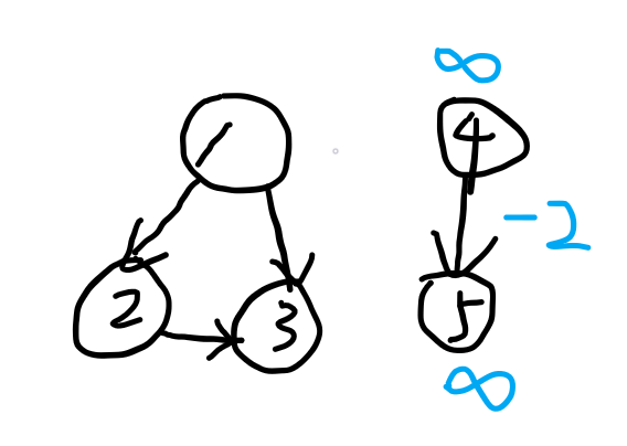 因为4到5的边权值为负的,那么1到5的距离是INF,这个点可能经过了4,也就是经过了负边,到点5,这时候1和5的距离会被更新为INF+负边权,因此比INF小了。