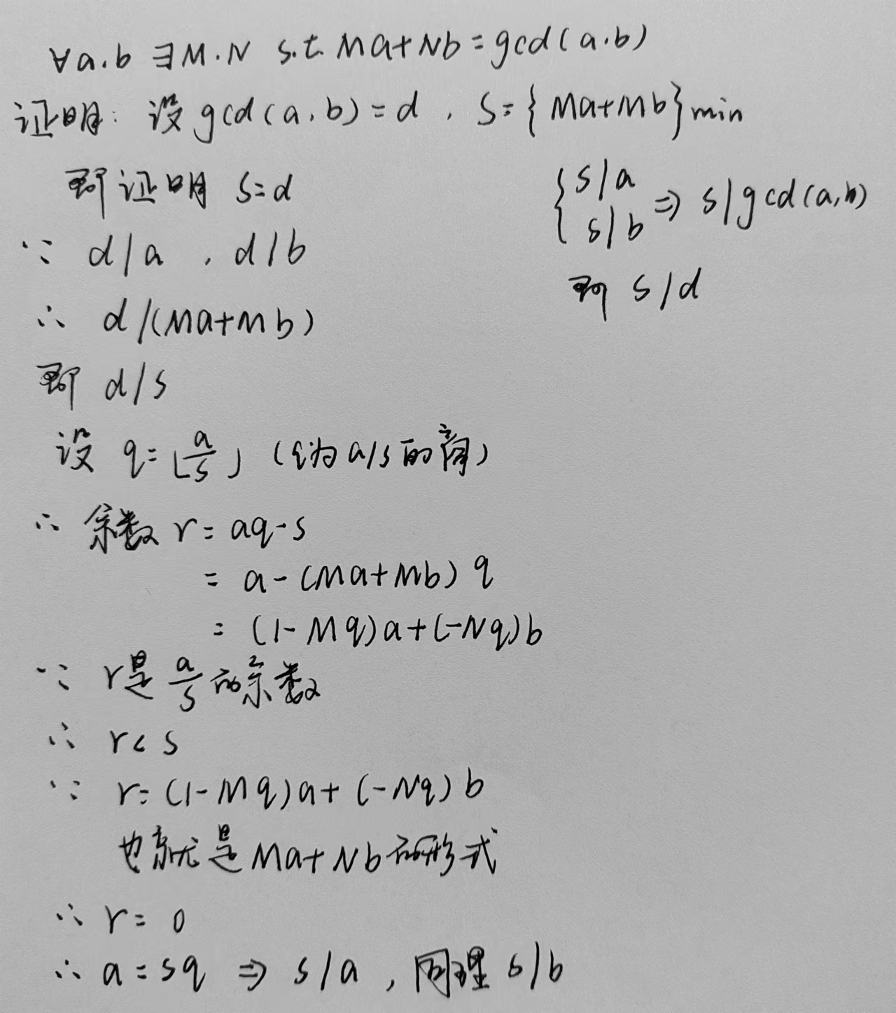 定理内容:若 a,b 是整数,且 gcd(a,b)=d,那么对于任意的整数 x ,y,ax+by 都一定是 d 的倍数,特别地,一定存在整数 x , y 使 ax+by=d 成立。