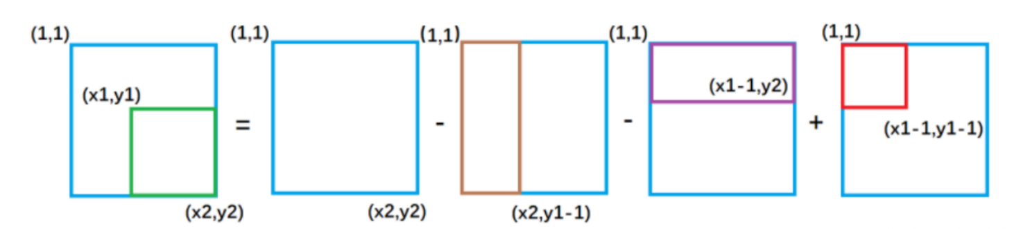 那么二位前缀和的公式即:s[x2,y2] - s[x2,y1-1] - s[x1-1,y2] + s[x1-1,y1-1]。